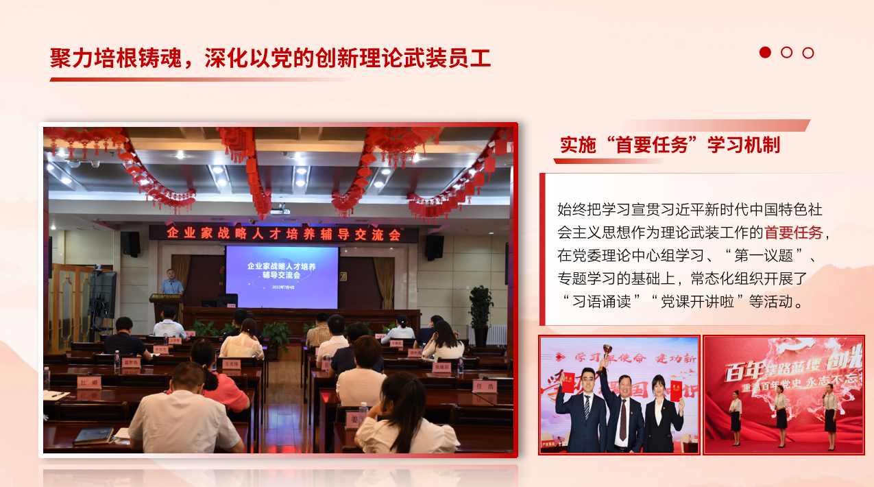 近年來(lái),集團(tuán)黨委堅(jiān)持把思想政治工作作為一項(xiàng)經(jīng)常性、基礎(chǔ)性工作來(lái)抓,融入現(xiàn)代企業(yè)治理、經(jīng)營(yíng)管理、企業(yè)文化建設(shè)、員工隊(duì)伍建設(shè),形成了全員、全程、全覆蓋的國(guó)有企業(yè)大思政模式,有效發(fā)揮了“生命線”的獨(dú)特作用,推動(dòng)了企業(yè)高質(zhì)量發(fā)展。實(shí)施“首要任務(wù)”學(xué)習(xí)機(jī)制,實(shí)施核心價(jià)值培育機(jī)制,實(shí)施企業(yè)文化熔鑄機(jī)制,推動(dòng)愛(ài)國(guó)主義、集體主義、社會(huì)主義教育深深融入員工血脈,厚培員工以企為家、愛(ài)企如家的歸屬感和凝聚力。