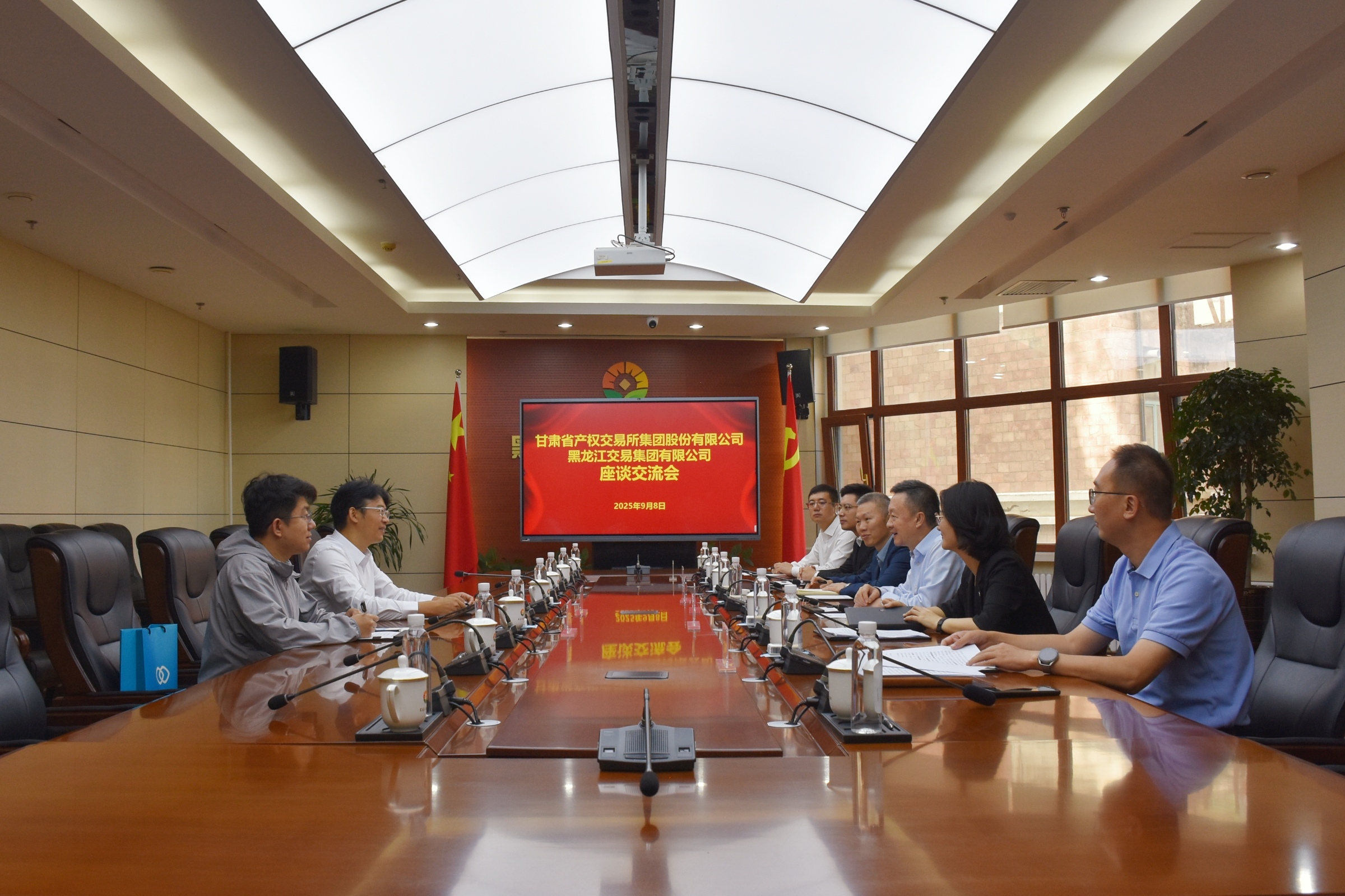 9月8日,甘肅省產(chǎn)權(quán)交易所集團(tuán)黨委副書記、總經(jīng)理趙永濤一行到黑龍江交易集團(tuán)進(jìn)行座談交流,黑龍江交易集團(tuán)黨委書記、董事長(zhǎng)夏明禹與來(lái)訪客人進(jìn)行座談。黑龍江交易集團(tuán)黨委副書記、副董事長(zhǎng)、總經(jīng)理王志昕,副總經(jīng)理單勇,集團(tuán)有關(guān)部門及權(quán)屬企業(yè)相關(guān)同志參加座談。雙方圍繞企業(yè)戰(zhàn)略布局、創(chuàng)新業(yè)務(wù)發(fā)展等重點(diǎn)工作,及新興業(yè)務(wù)領(lǐng)域創(chuàng)新實(shí)踐典型案例開(kāi)展深入交流研討。