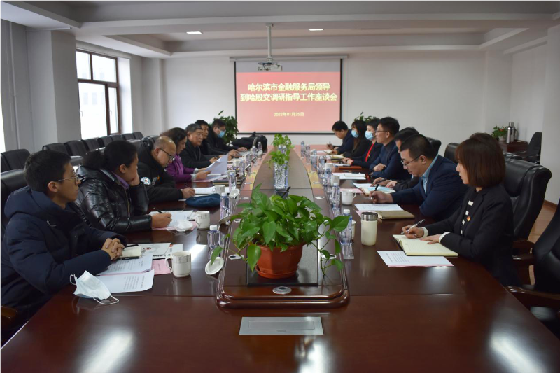 1月25日下午,哈爾濱市金融服務(wù)局局長孫婉睿一行到哈爾濱股權(quán)交易中心(以下簡稱哈股交)調(diào)研指導(dǎo)工作。哈爾濱市金融服務(wù)局副局長邵偉、副局長陳方暉等一同參加調(diào)研。哈股交黨支部書記、董事長王全武主持調(diào)研座談會并作工作匯報,哈股交中層以上管理人員參加調(diào)研座談會。