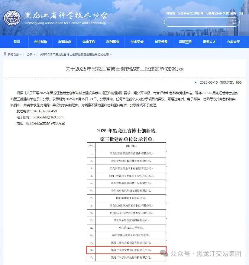 新聞中心 > 子公司動態(tài)黑龍江省科學(xué)技術(shù)協(xié)會、黑龍江省工商業(yè)聯(lián)合會、共青團(tuán)黑龍江省委員會聯(lián)合發(fā)布通知,公布2025年黑龍江省博士創(chuàng)新站第三批建站單位名單。黑龍江股權(quán)交易中心憑借在服務(wù)科創(chuàng)企業(yè)、搭建資本橋梁、培育創(chuàng)新生態(tài)等領(lǐng)域的突出表現(xiàn),成功入選建站單位名單,這是對龍江股交在科技成果轉(zhuǎn)化、知識產(chǎn)權(quán)運(yùn)用、資本市場服務(wù)工作的權(quán)威認(rèn)可,更是對龍江股交助力“創(chuàng)新龍江”建設(shè)關(guān)鍵成效的充分肯定。