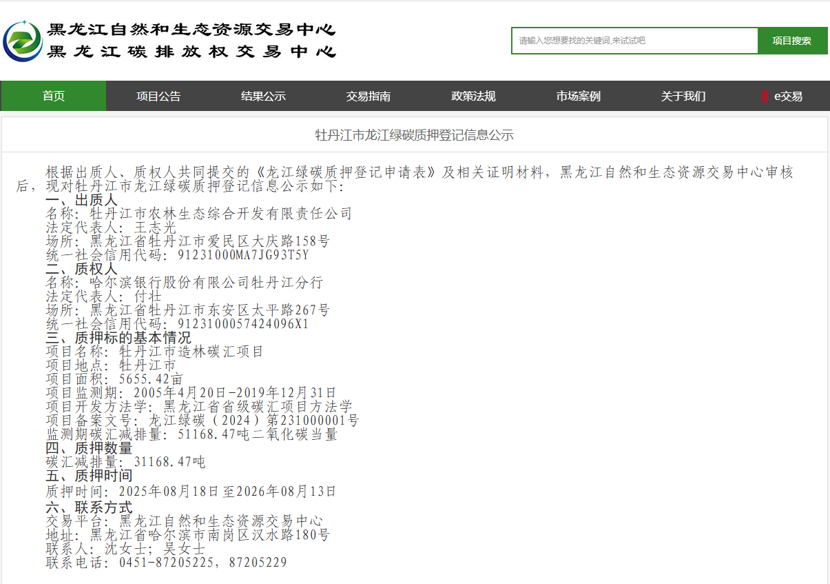 黑龍江自然和生態(tài)資源交易中心辦理完成全省首宗龍江綠碳質(zhì)押貸款登記業(yè)務(wù),借貸雙方通過自然生態(tài)交易中心平臺實(shí)施龍江綠碳凍結(jié)功能,公示相關(guān)質(zhì)押信息,融資額1000萬元,打通了以“碳匯+金融”盤活碳匯存量資產(chǎn)的新模式,進(jìn)一步拓寬了龍江綠碳價值實(shí)現(xiàn)渠道。